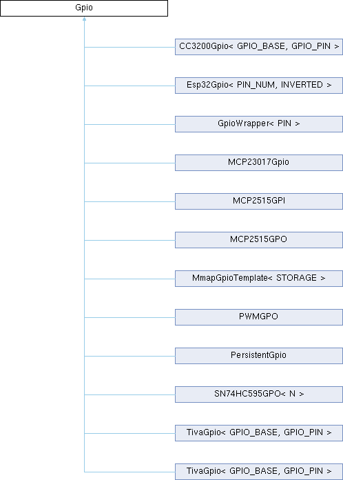 Implemented in GpioWrapper< PIN >, MCP23017Gpio, PersistentGpio, Esp32Gpio< PIN_NUM, INVERTED >, CC3200Gpio< GPIO_BASE, GPIO_PIN >, TivaGpio< GPIO_BASE, GPIO_PIN >, MmapGpioTemplate< STORAGE >, MCP2515GPO, MCP2515GPI, PWMGPO, and SN74HC595GPO< N >.