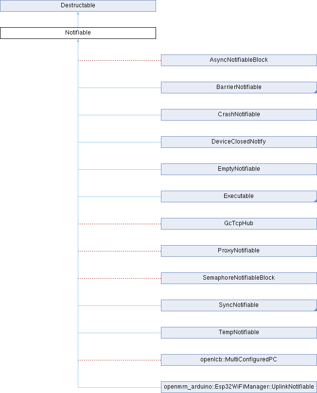 Implemented in AsyncNotifiableBlock::QueuedBarrier, AsyncNotifiableBlock, Executable, SyncNotifiable, EmptyNotifiable, CrashNotifiable, ProxyNotifiable, BarrierNotifiable, TempNotifiable, SemaphoreNotifiableBlock, StateFlowBase, StateFlowWithQueue, ActiveTimers, openmrn_arduino::Esp32WiFiManager::UplinkNotifiable, openlcb::DatagramClientImpl, DeviceClosedNotify, GcTcpHub, and GcHubPort.